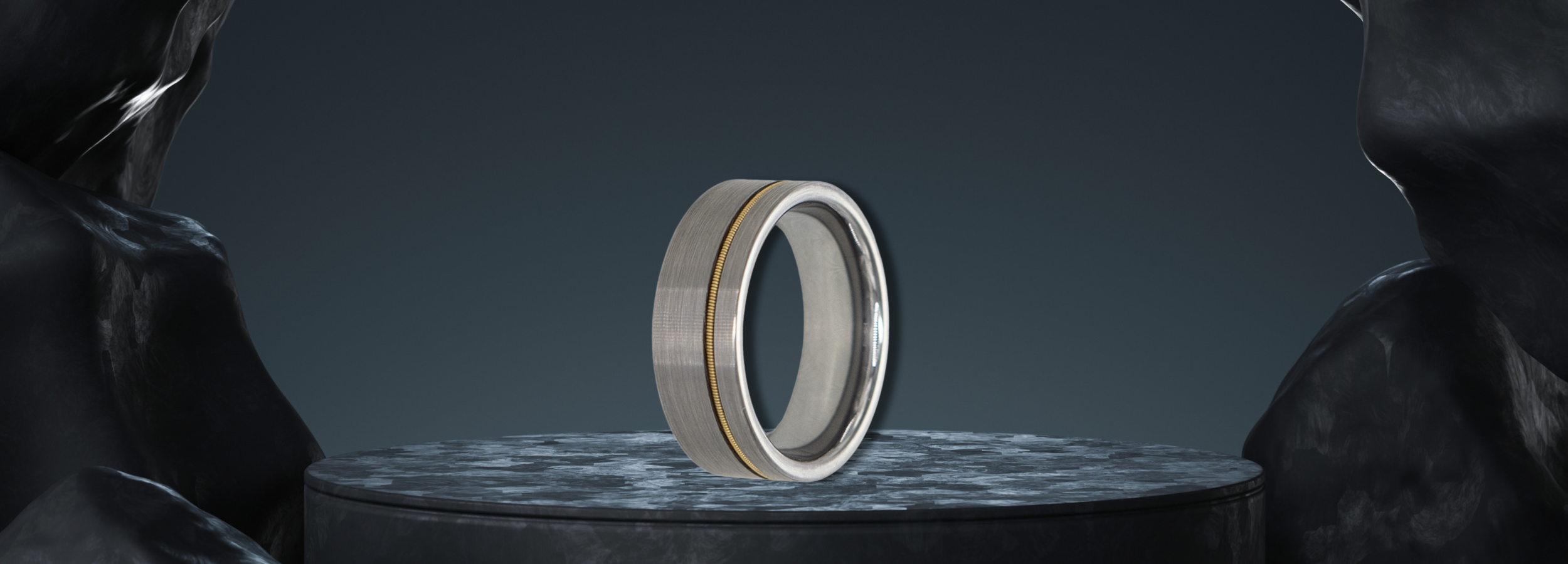 Orpheus ring – Brushed Silver Tungsten with Gold Guitar String Inlay from The Hustler Collection. Angled view highlighting shape and finish.Orpheus ring – Brushed Silver Tungsten with Gold Guitar String Inlay from The Hustler Collection. Angled view with product name overlay.