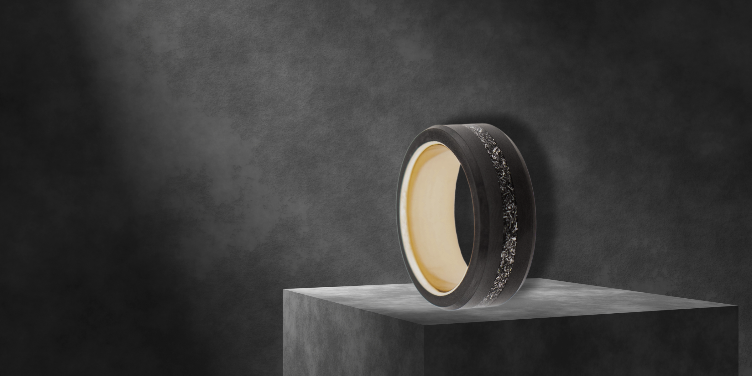 Eros ring – polished Black Ceramic featuring Whiskey Barrel Wood, Deer Antler and Black Arrow Foil part of the Hustler Collection. Angled view highlighting shape and finish.Eros ring – polished Black Ceramic featuring Whiskey Barrel Wood, Deer Antler and Black Arrow Foil part of the Hustler Collection. Angled view with product name overlay.