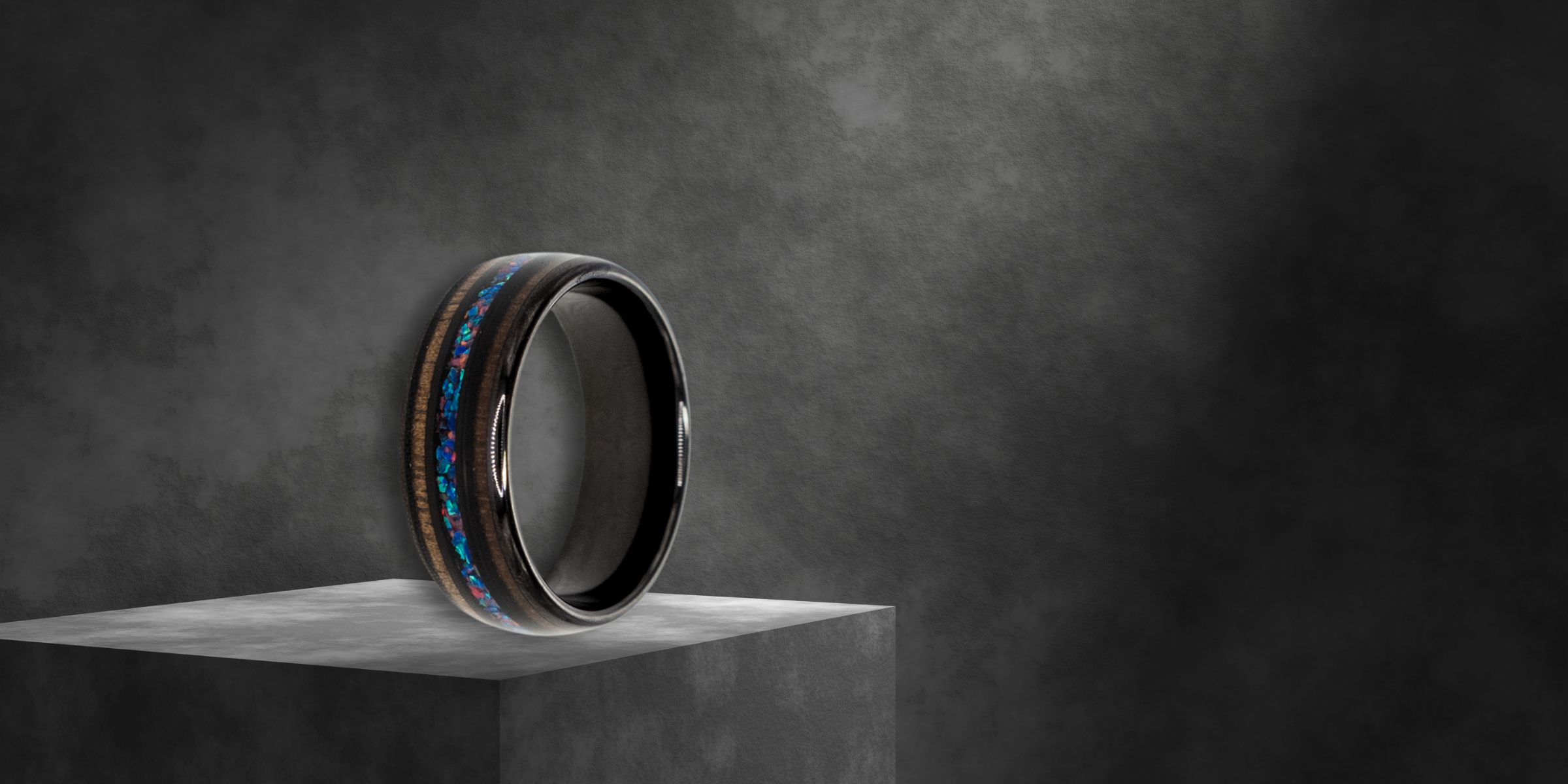 Nereus ring – Black Tungsten featuring Double Koa Wood and Crushed Opal Inlays from the Hustler Collection. Angled view highlighting shape and finish.Nereus ring – Black Tungsten featuring Double Koa Wood and Crushed Opal Inlays from the Hustler Collection.  Angled view with product name overlay.