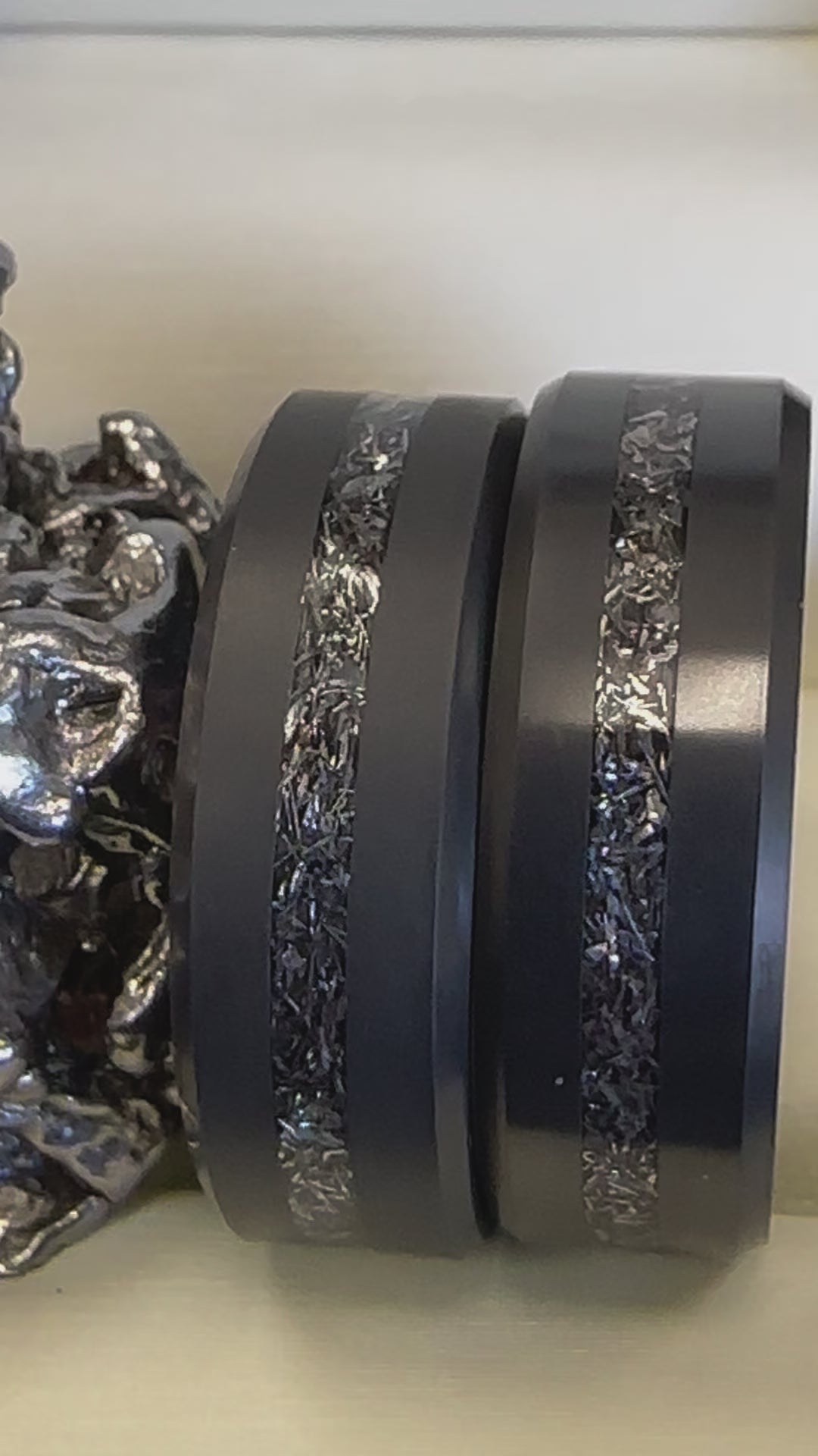 Elysium Ares - Solid Black Diamond ring featuring an Authentic Muonionalausta Meteorite Inlay. Each of our rings is made of millions of pressed diamond crystals formed into a solid diamond band that becomes black due to the enormous pressure & heat. Elysium Black Diamond is rated a 10 on the Mohs scale, making it the hardest and most-scratch resistant material on earth, the perfect symbol of your commitment.